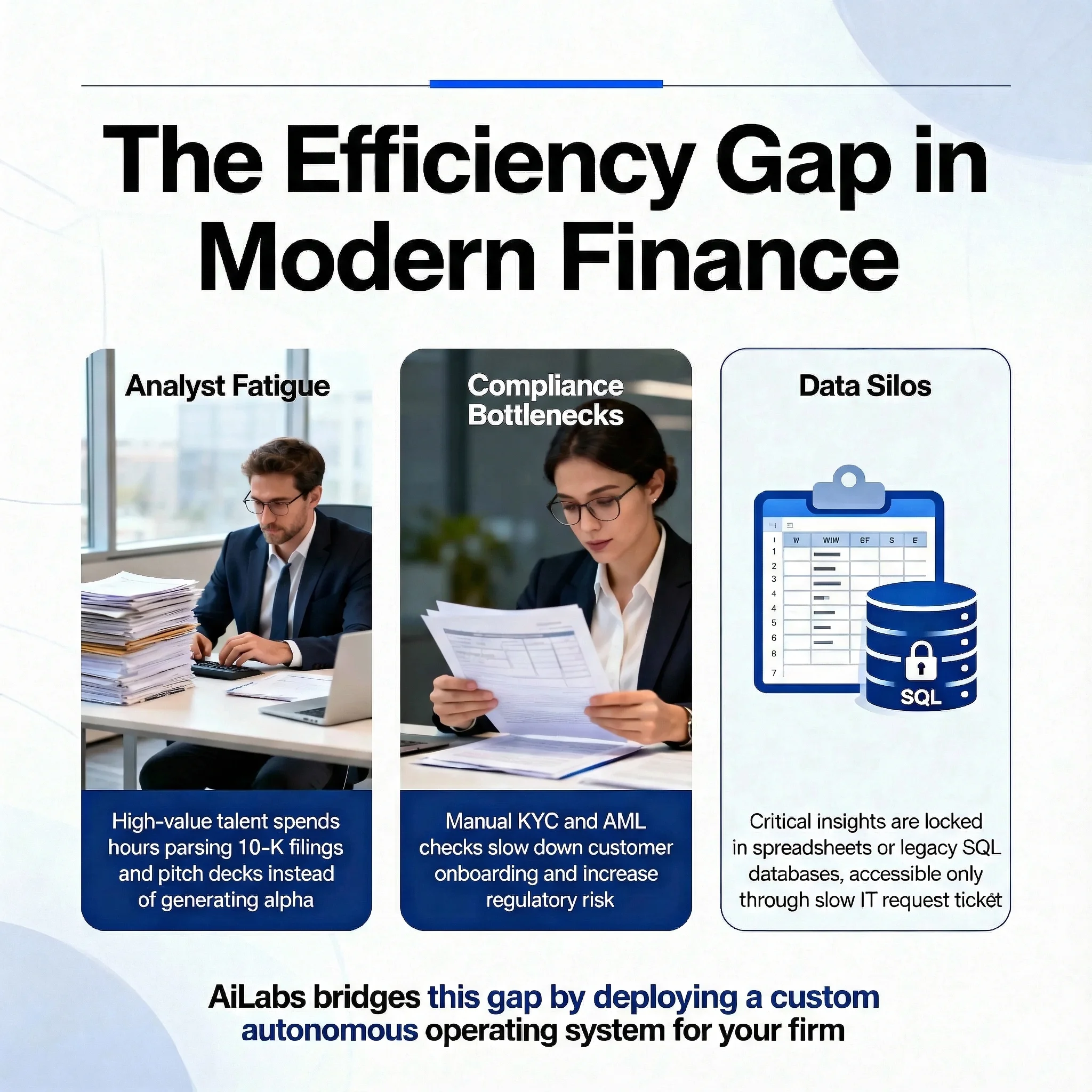 Financial institutions are data-rich but process-poor. Your most valuable assets—investment analysts, loan officers, and compliance managers—are trapped in a cycle of manual data entry and legacy system navigation.